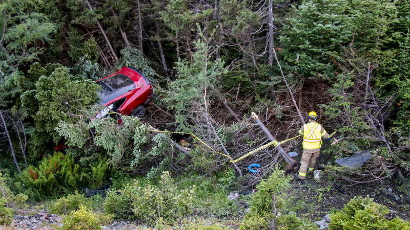 At about 8:00 p.m. emergency crews were called to the westbound lanes of the highway, between Thorburn Road and Topsail Road. The driver of a sports car had lost control of the vehicle, causing it to leave the road and go down an embankment. The vehicle traveled several dozen metres, rolling over, and coming to rest among the trees.