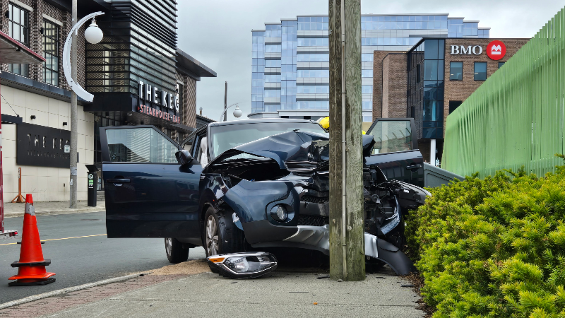 Crews were called to Harbour Drive, near Becks Cove, shortly after 3:30 p.m.. The driver of an eastbound car had crossed oncoming lanes before going over the sidewalk and striking a utility pole. The vehicle sustained extensive damage, however the pole was unaffected. Personnel tended to the driver, who is reported to have suffered only minor injuries.