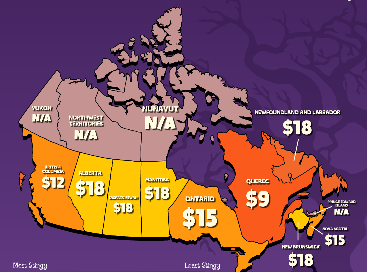 - Newfoundland and Labrador residents on average will spend $18.44 on Halloween candy this year, making them the most generous province in Canada – this is 17% more than the national average ($15.78)