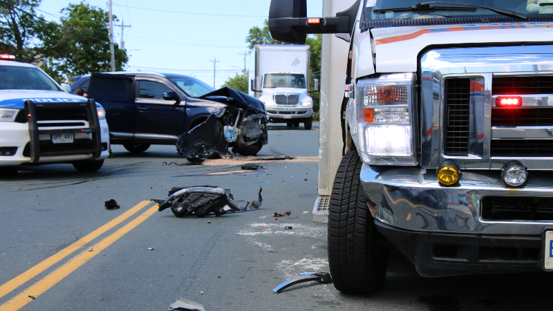 The crash happened at the intersection of Topsail Road and Cowan Avenue shortly before 11:00 a.m., when an ambulance traveling eastbound on Topsail Road struck an SUV traveling northbound on Cowan Ave.