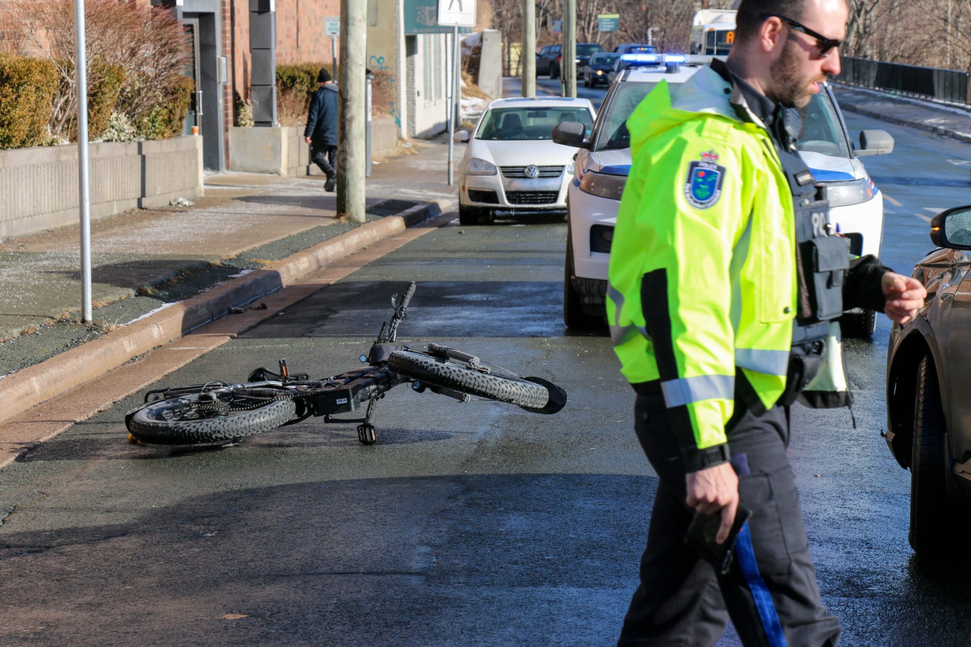 Shortly after 10:00 a.m. emergency crews were called to Harvey Road, near the Paramount Building. A collision had occurred between an electric bicycle and an SUV. The operator of the e-bike was treated at the scene by first responders before being helped onto a stretcher. Paramedics took the individual to hospital with injuries not believed to be serious. The driver of the SUV was uninjured. Both the vehicle and e-bike sustained minor damage in the collision.