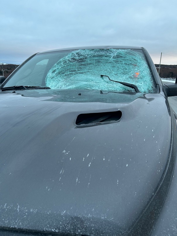 At approximately 4:30 p.m. on Monday, a northbound pickup truck was heavily damaged while passing by a southbound commercial vehicle.  A large quantity of ice and snow from the top of the commercial vehicle gave way and struck the front of the pickup truck, causing damage to the hood, windshield and roof. Thankfully, the driver of the pickup truck was uninjured. The commercial vehicle continued driving southbound on the highway without stopping.