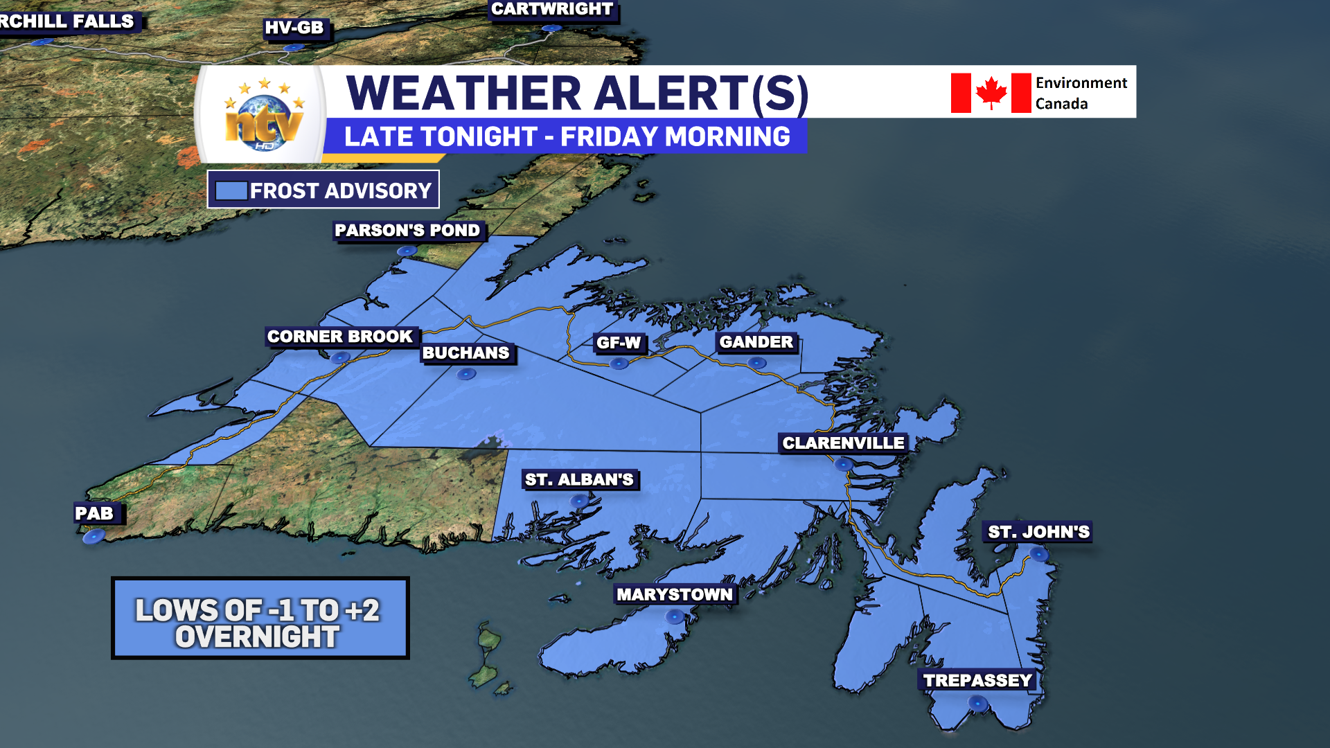 The Environment and Climate Change Weather Office in Gander has issued a FROST ADVISORY for areas of Central, Southern, interior, and western Newfoundland for tonight. Areas under the Advisory are as follows: