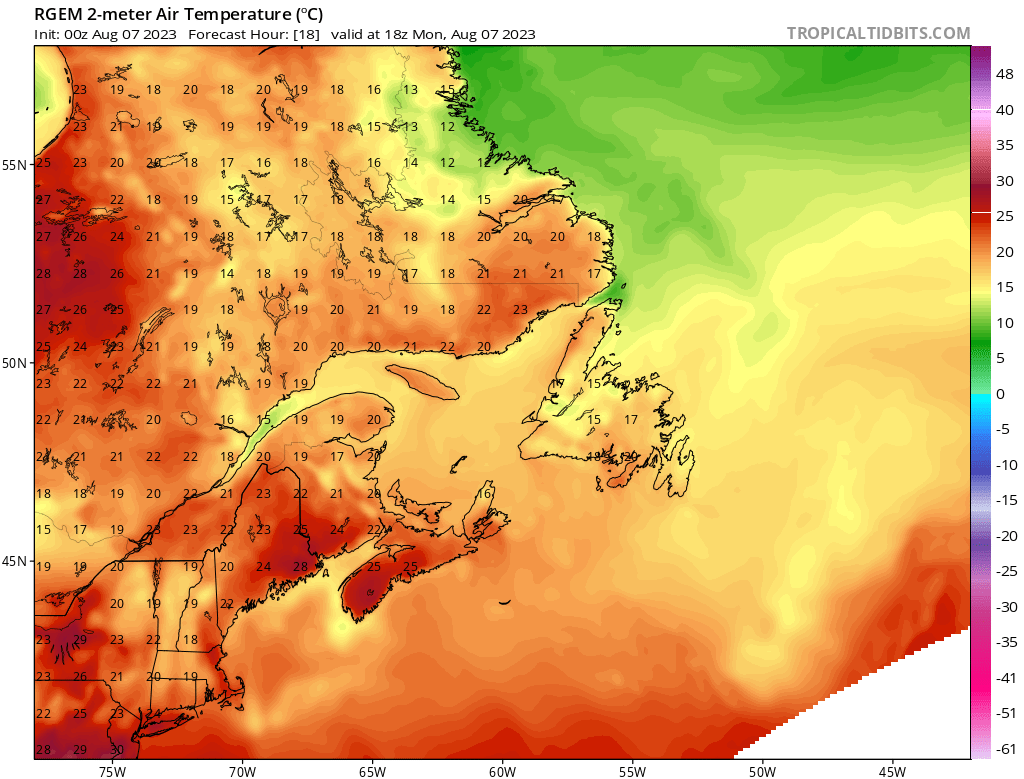 The low to our east will generate lots of northerly/onshore flow across much of the Island and parts of Labrador today. This pattern generally brings cool temperatures, clouds, and showers to areas near and on north-facing shores and today will be no different. In today’s case, the showers will be most prevalent over coastal areas of central and eastern Newfoundland but will be possible as far south as the South Coast. Coastal Labrador will also see some showers to start the day, but they should become less widespread by the early afternoon. The loop from the RDPS model (below) illustrates this point rather well.