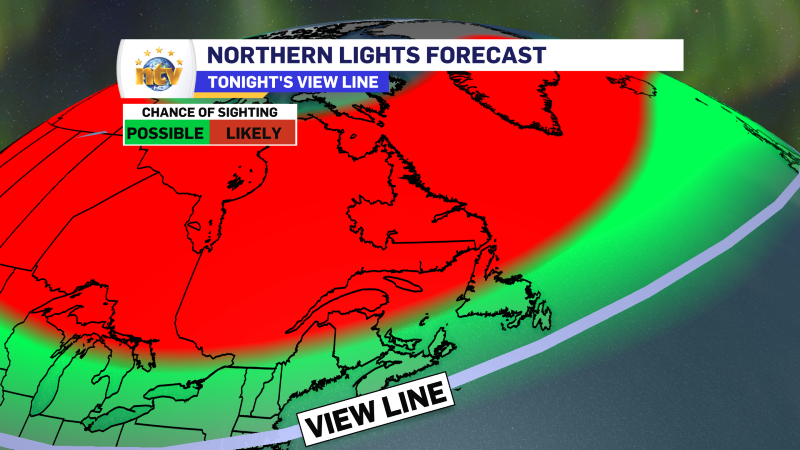 When looking at the forecast for the likelihood of the Aurora Borealis (Northern Lights) occurring, there is an index called the Planetary K Index. This is a scale from 0 to 9. Simply put, the higher the value, the farther south the northern lights can be spotted. Tonight’s forecast fluctuates between 7 and 8, with 8 making up most of the night. The image at the top of the post shows the view line. North of that line is where you want to be in order to have the best chance of seeing the overnight skies lit up. Notice ALL of the province is north of that line tonight?