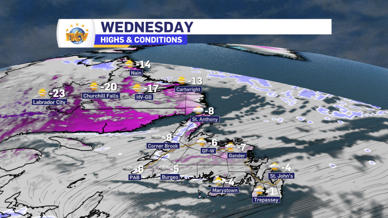 Today will be colder than yesterday, by quite a lot, across the Island portion of the Province. Highs range between -5 and -10, with wind chills into the minus teens and 20s. An area of snow squalls will be found on and near the West Coast. Some of the squalls will be intense, generating locally heavy snowfall, wind gusts to 70 km/h, and subsequent reduced visibilities.