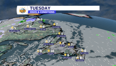 A few showers over central and western Newfoundland, and in Labrfaodr West. Otherwise it is partly to mostly cloudy with highs in the upper single digits in Labrador to middle teens on the Island.
