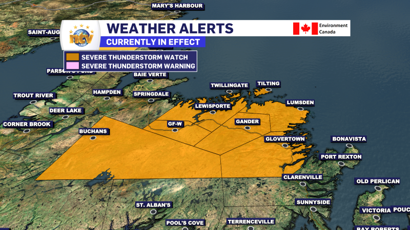 The Environment and Climate Change Canada Weather Office in Gander has issued a Severe Thunderstorm Watch for the following areas from this afternoon until this evening: