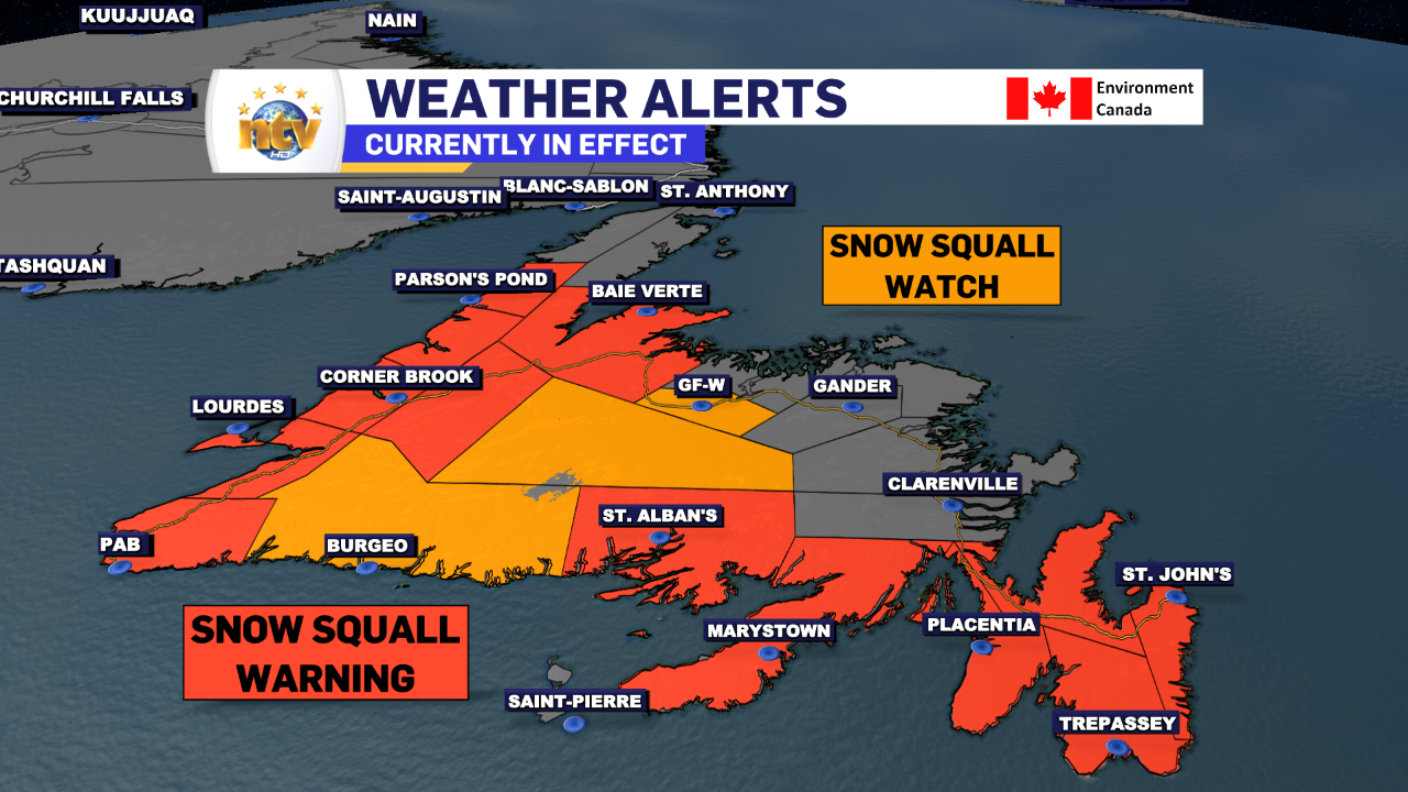 Snow Squall & Wind Warnings are in effect for the Island, Winter Storm conditions persist in parts of Labrador