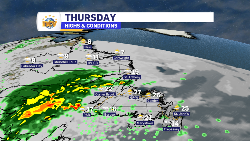 - Chance of rain for eastern Newfoundland, while it will be mostly cloudy with a chance of showers in Central and on the West Coast.