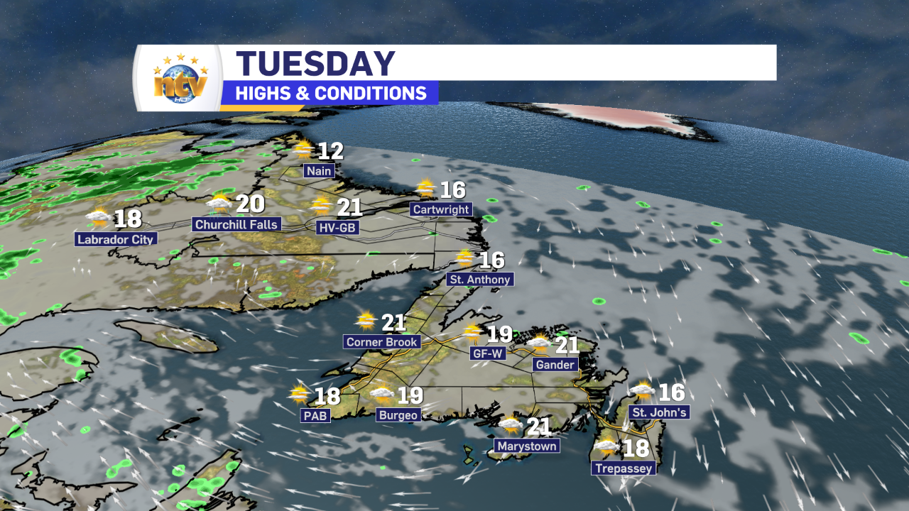Temperatures this afternoon will be very similar to yesterday, where much of the Province peaks in the mid-teens to lower 20s. The warmest readings will be found in southwestern Newfoundland and interior and western parts of Labrador. While the coolest readings will be found along the coast of Labrador and near and along the north-facing shores of the Island.