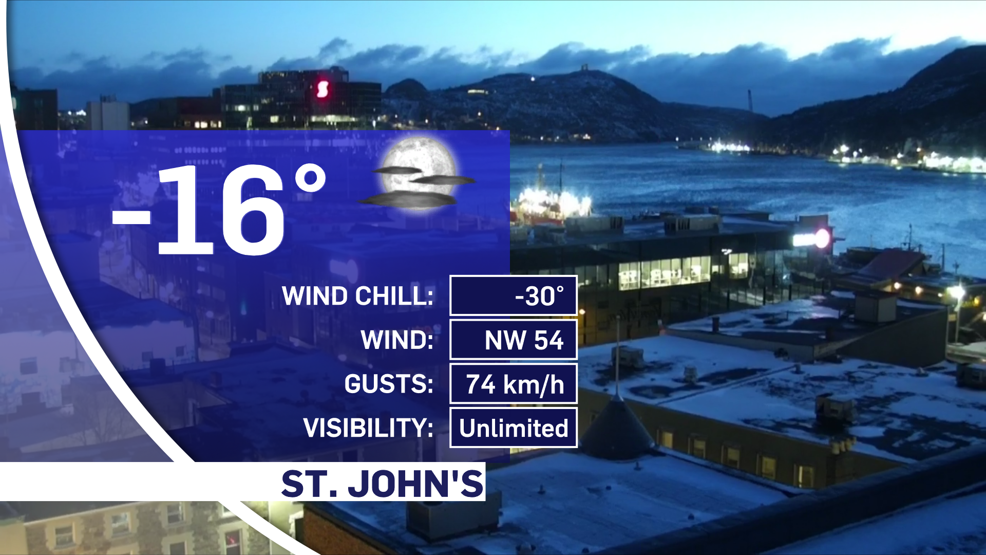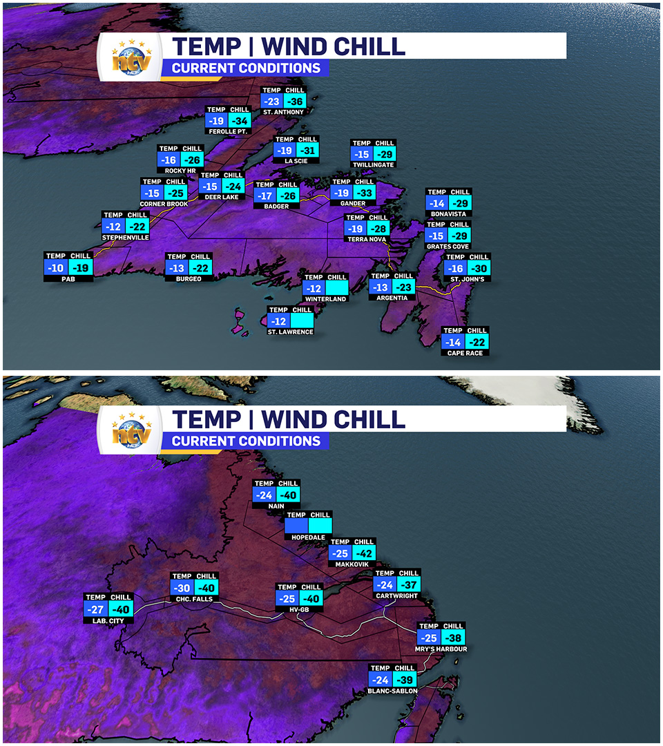 Temperatures across the Province this morning, as of 6:30 AM NST, are bitterly cold. Readings on the Island are into the minus teens below freezing, with wind chills in the -25 to -35 range. Labrador isn’t fairing much butter, with wind chills as low as -40.